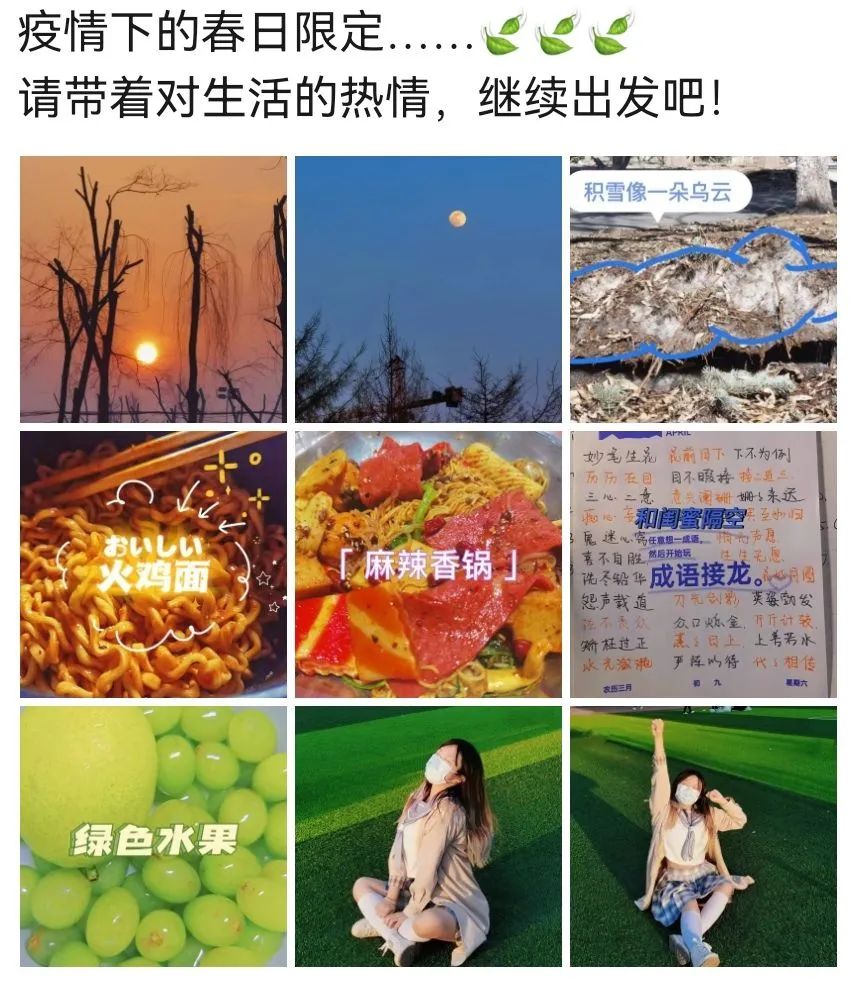 少年的青春不应只有被禁锢的自由,更应有草长莺飞的浪漫。通过“疫情下的春日限定活动”,同学们通过图片记录了带有春日气息的生活细节,让我们了解到疫情防控下别样多姿多彩的大员工活,在大家的积极参加下,收集到了很多优秀的作品,让我们来看看吧!