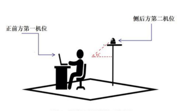 第一机位置于考生正前方,确保能够拍摄到考生本人头部、双手和答题纸;第二机位置于考生侧后方约45度,确保能够拍摄到考生本人、考试环境及正面机位屏幕。具体出镜效果请参照下图。